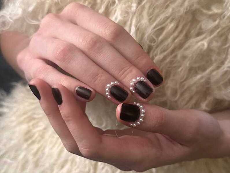 At Meruert Tolegen, nails were adorned with tiny pearls, adding a playful twist to a classic dark red polish. This combination of sophistication and whimsy is perfect for those who want to make a subtle yet striking statement.