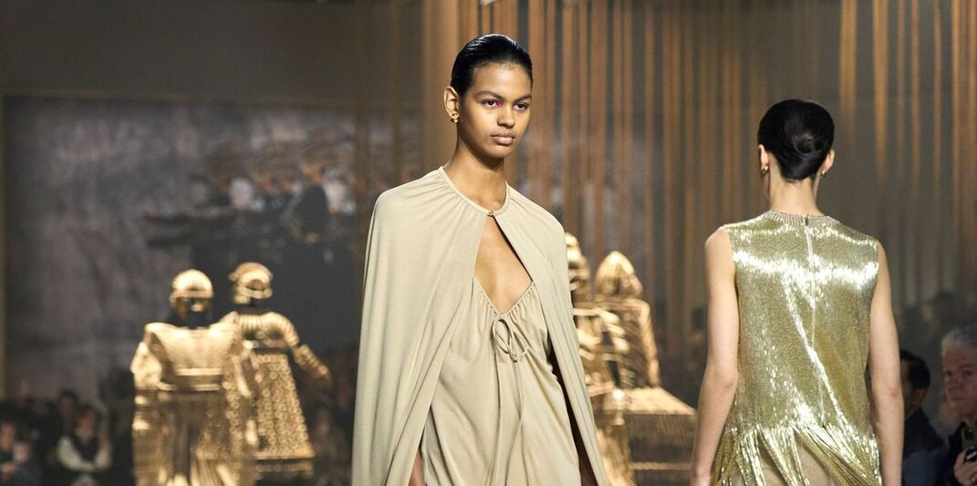 Peter Phillips and his team used Dior skincare products to prepare the models' skin, including the Dior Capture Totale Le Sérum and Dior Capture Totale Hyalushot for hydration. The makeup look focused on achieving a natural and radiant complexion, with the use of a star filter as a primer, followed by foundation and concealer tailored to each model's skin tone.